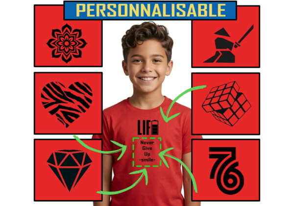 Choisis ton motif, ajoute tes mots, et crée un t-shirt rien qu’à toi !